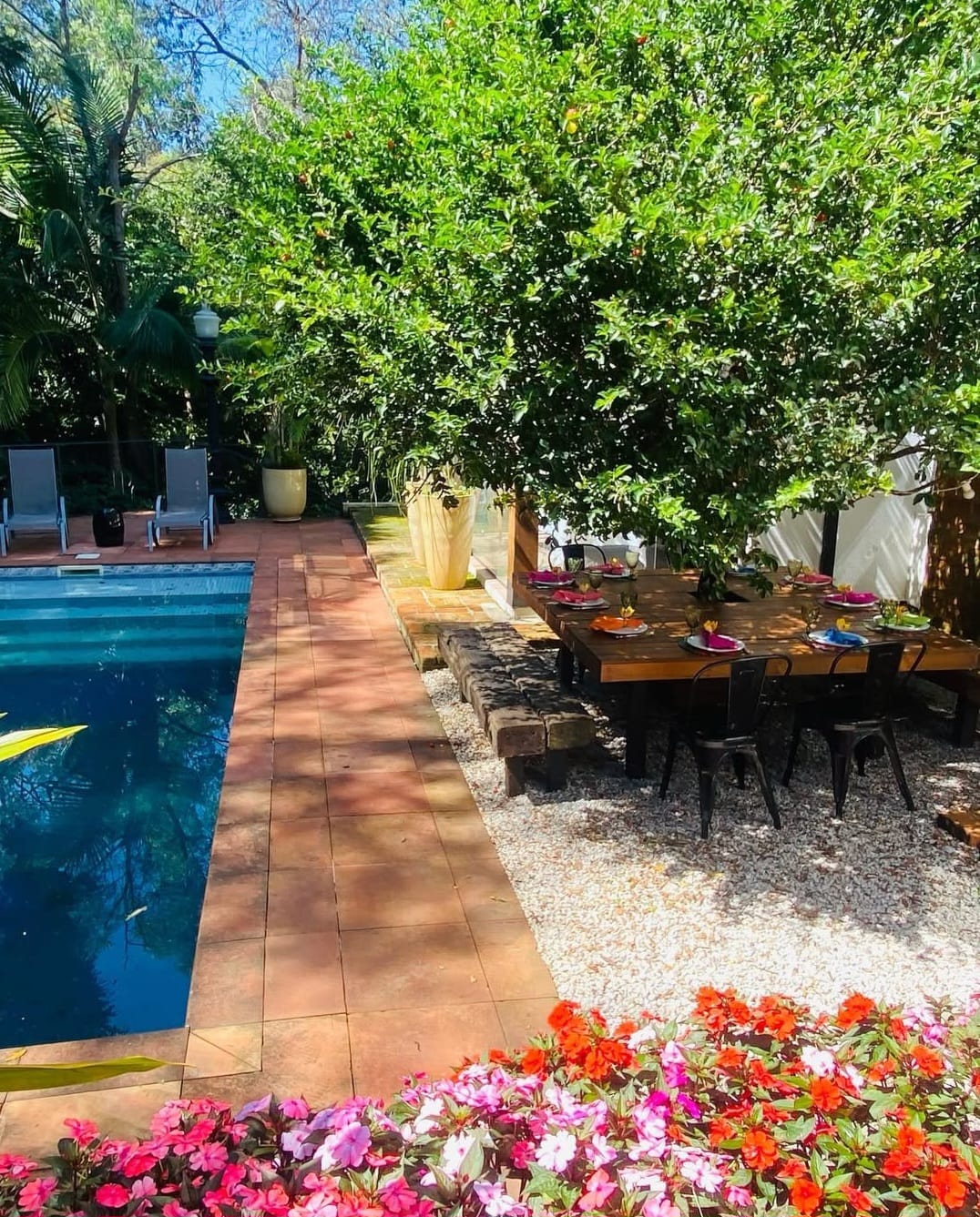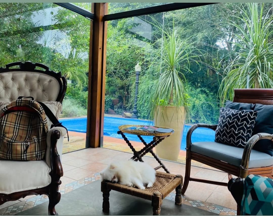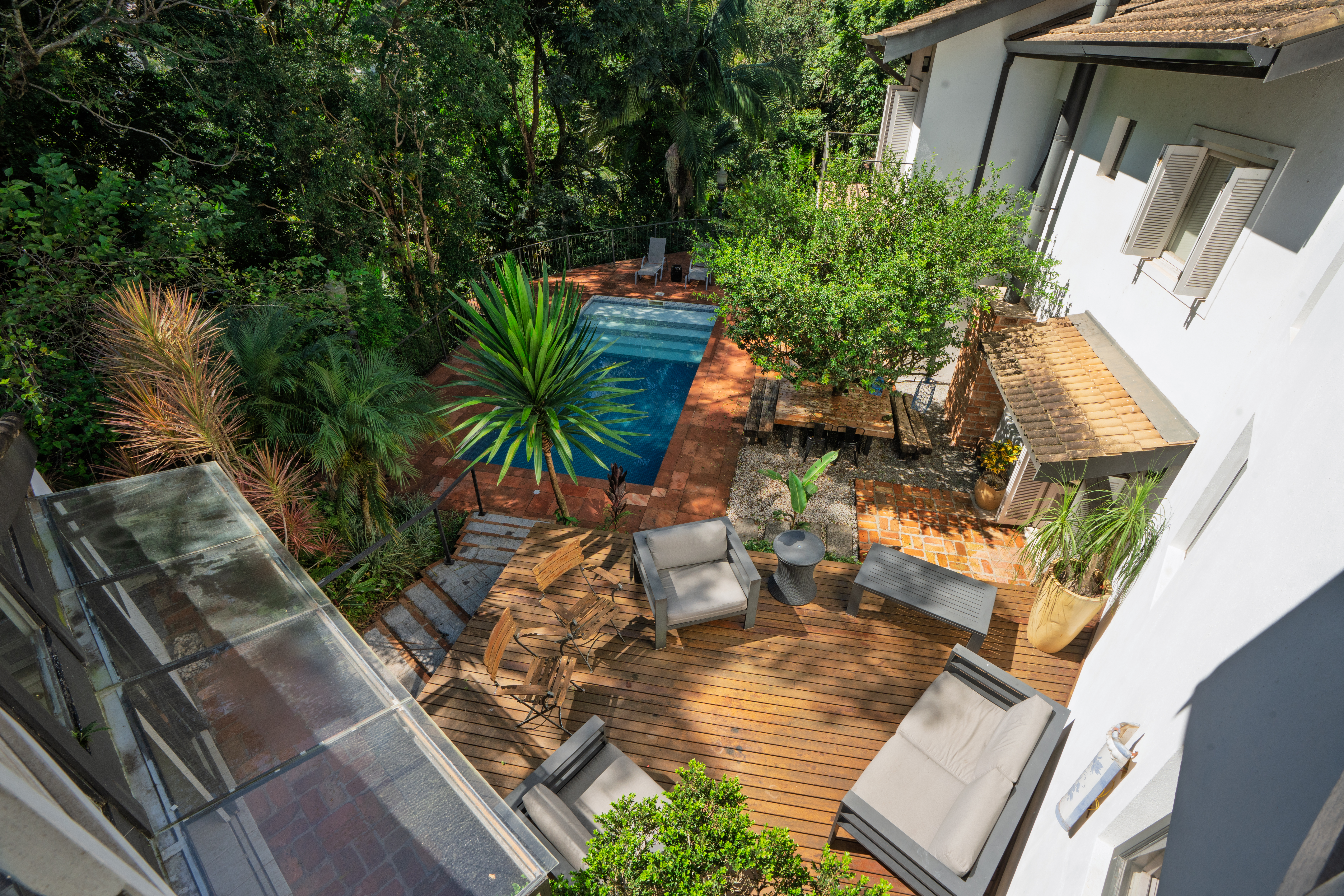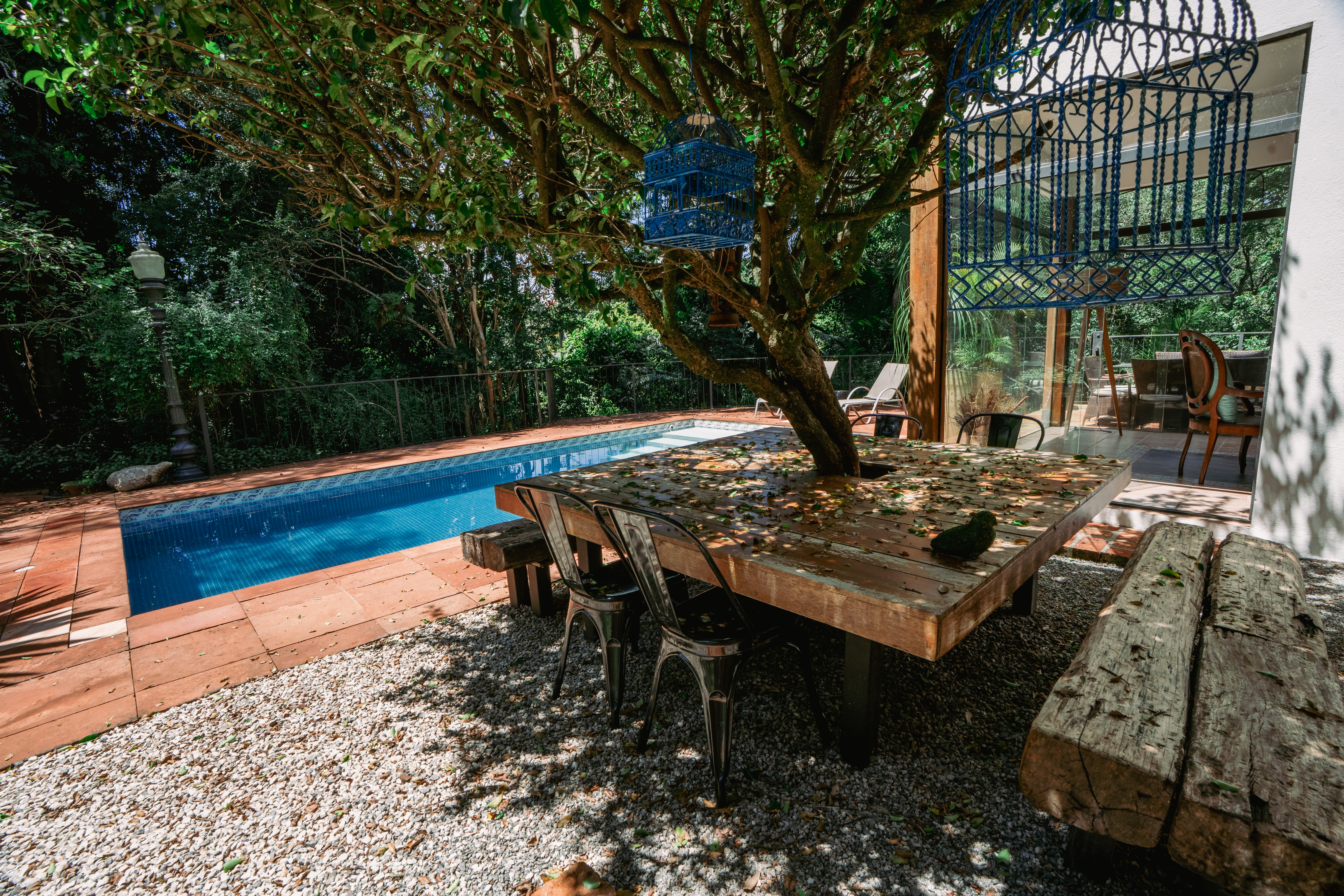 A área externa é protagonista: piscina envolta pelo verde, espaços de convivência ao ar livre e uma atmosfera de tranquilidade absoluta. Um cenário ideal para receber, descansar ou simplesmente estar.
