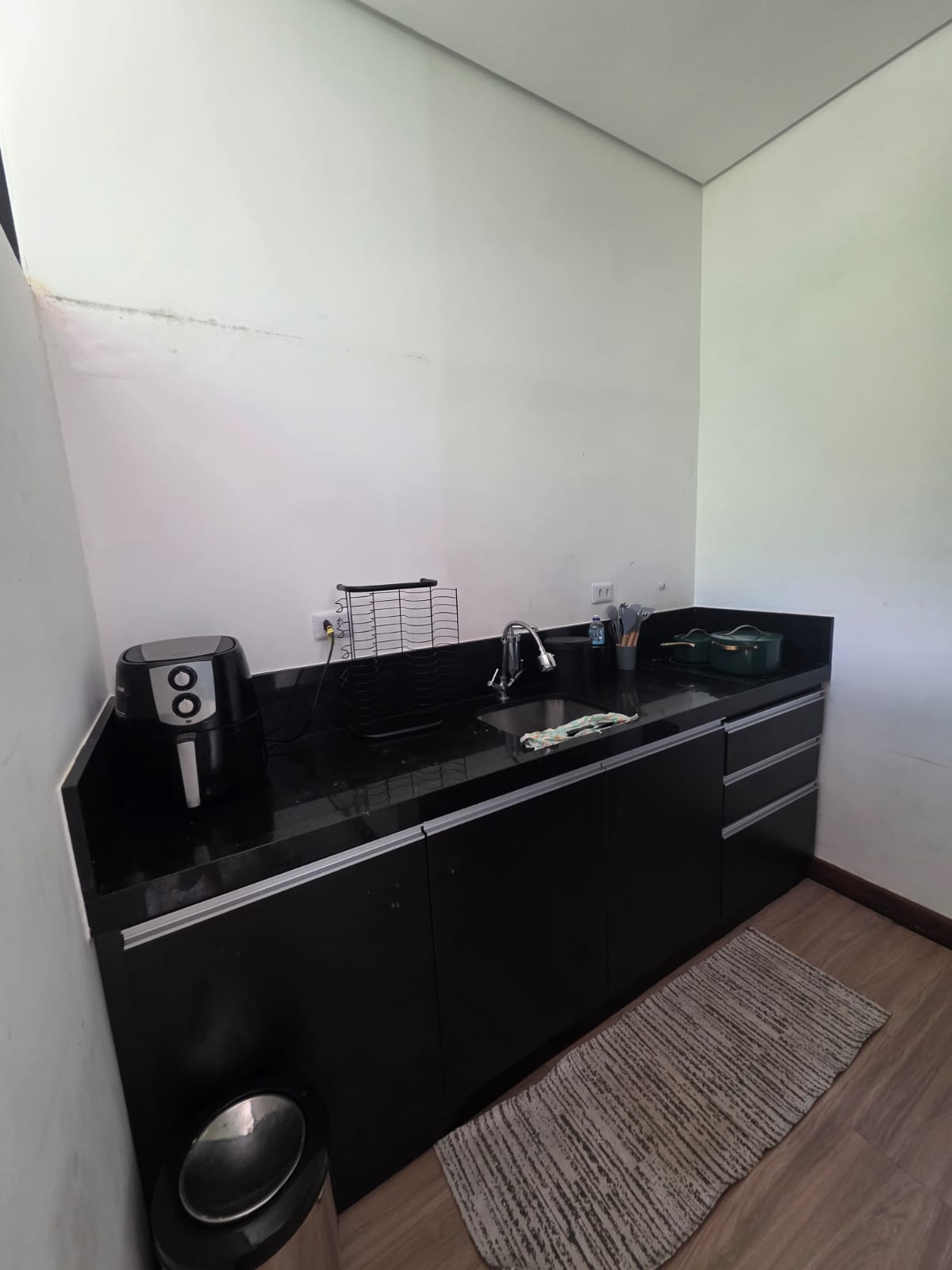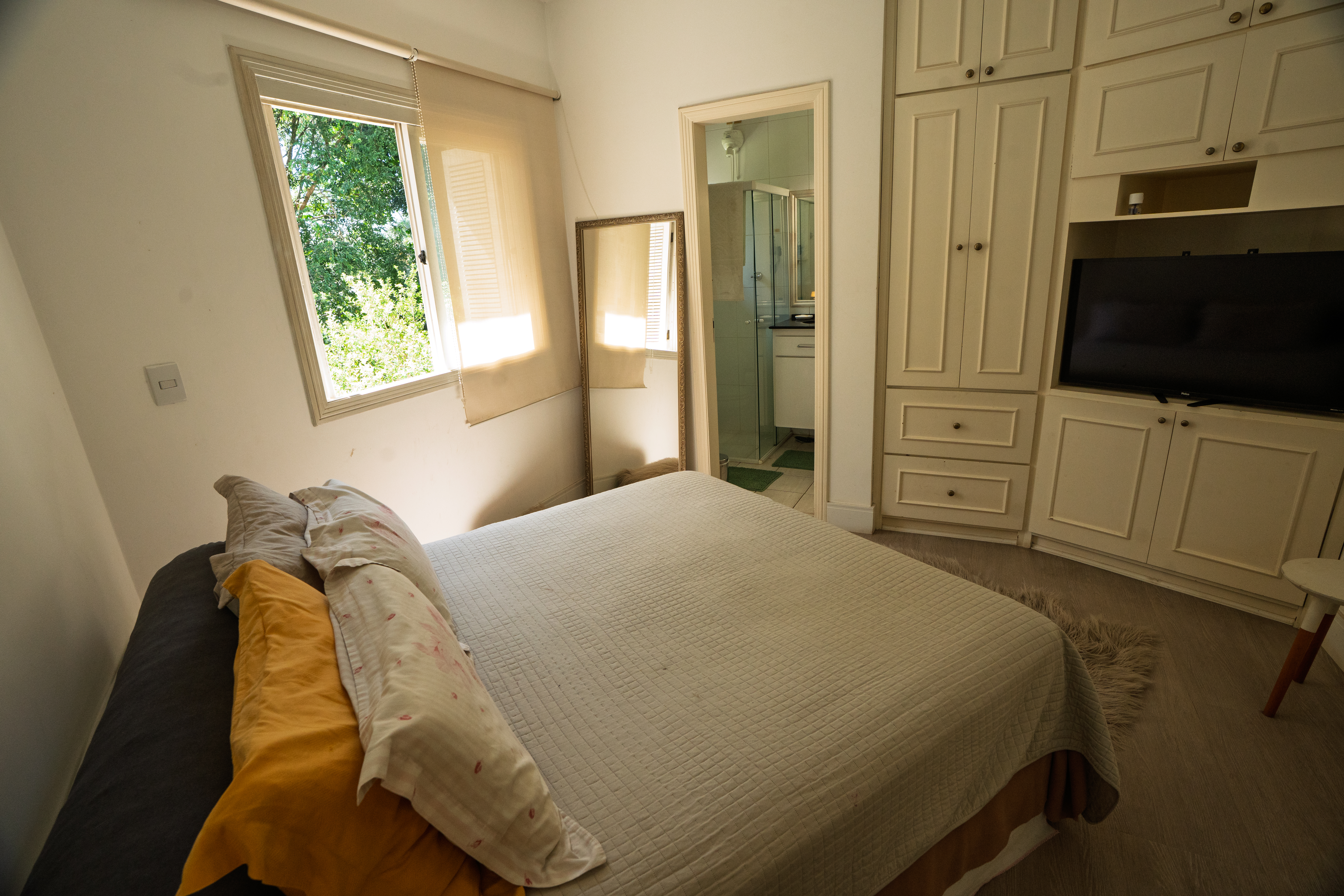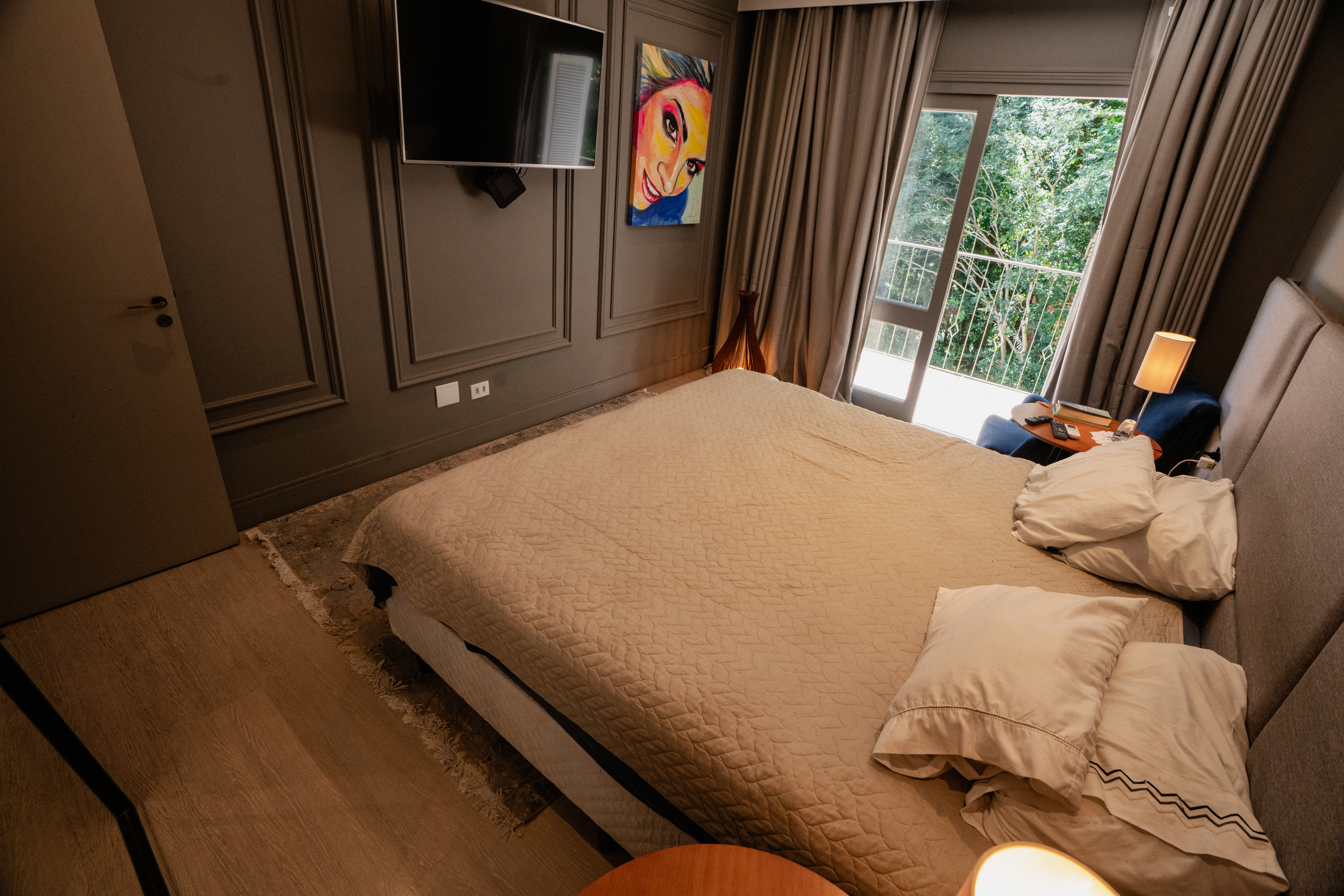 O loft oferece sala de TV, sala de jantar integrada, cozinha funcional, suíte com armários planejados e um jardim privativo, mantendo o mesmo diálogo com a natureza presente em toda a propriedade.