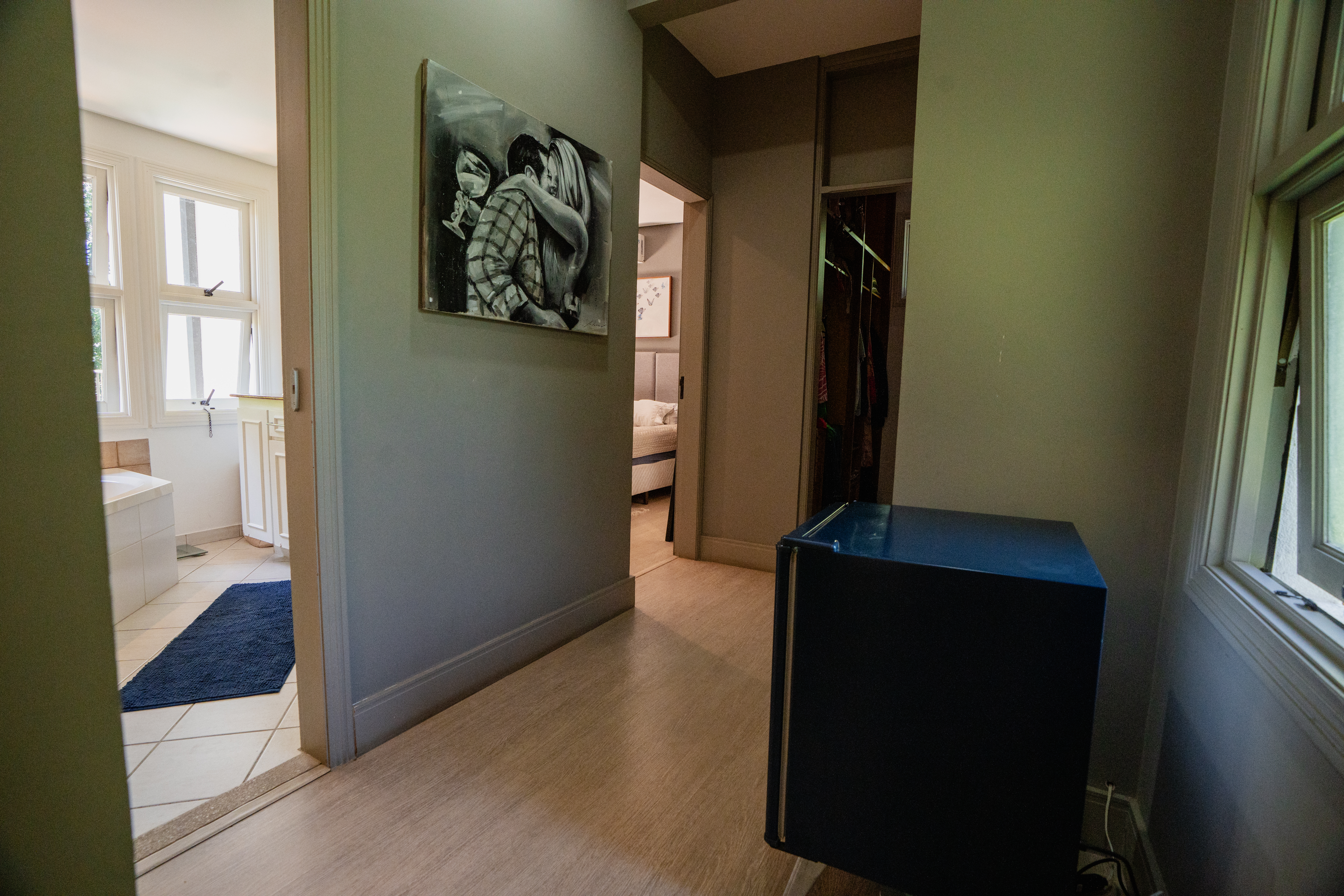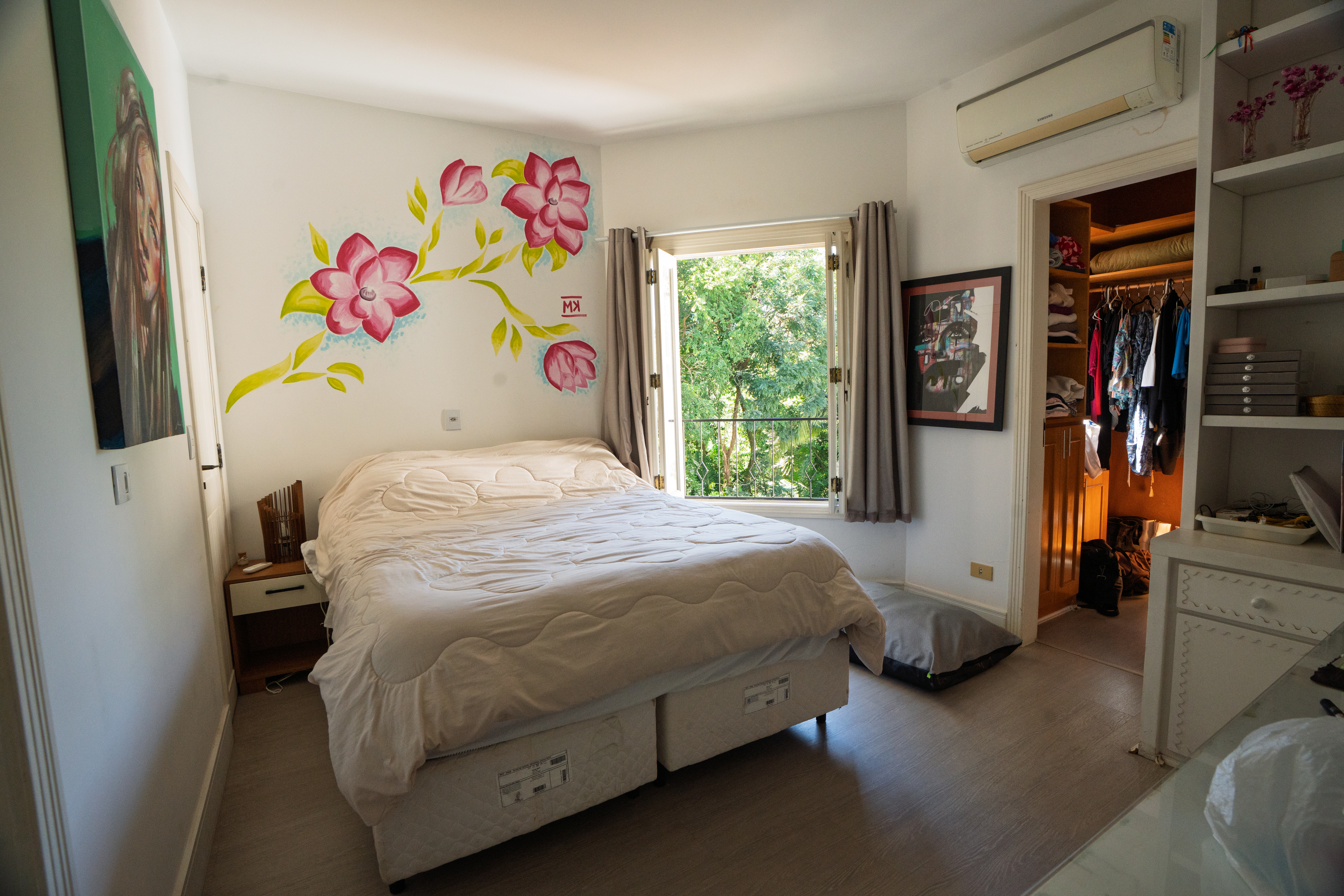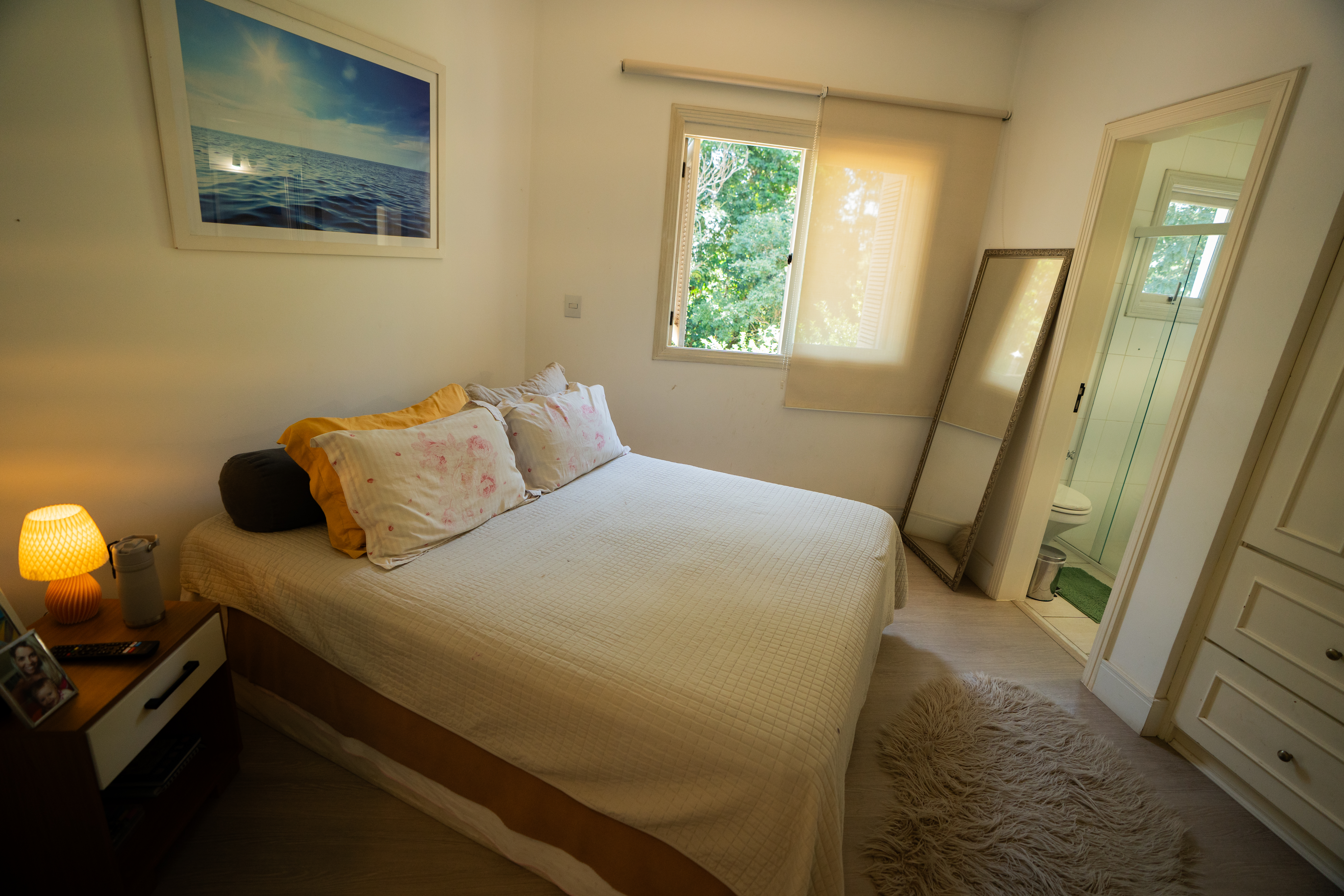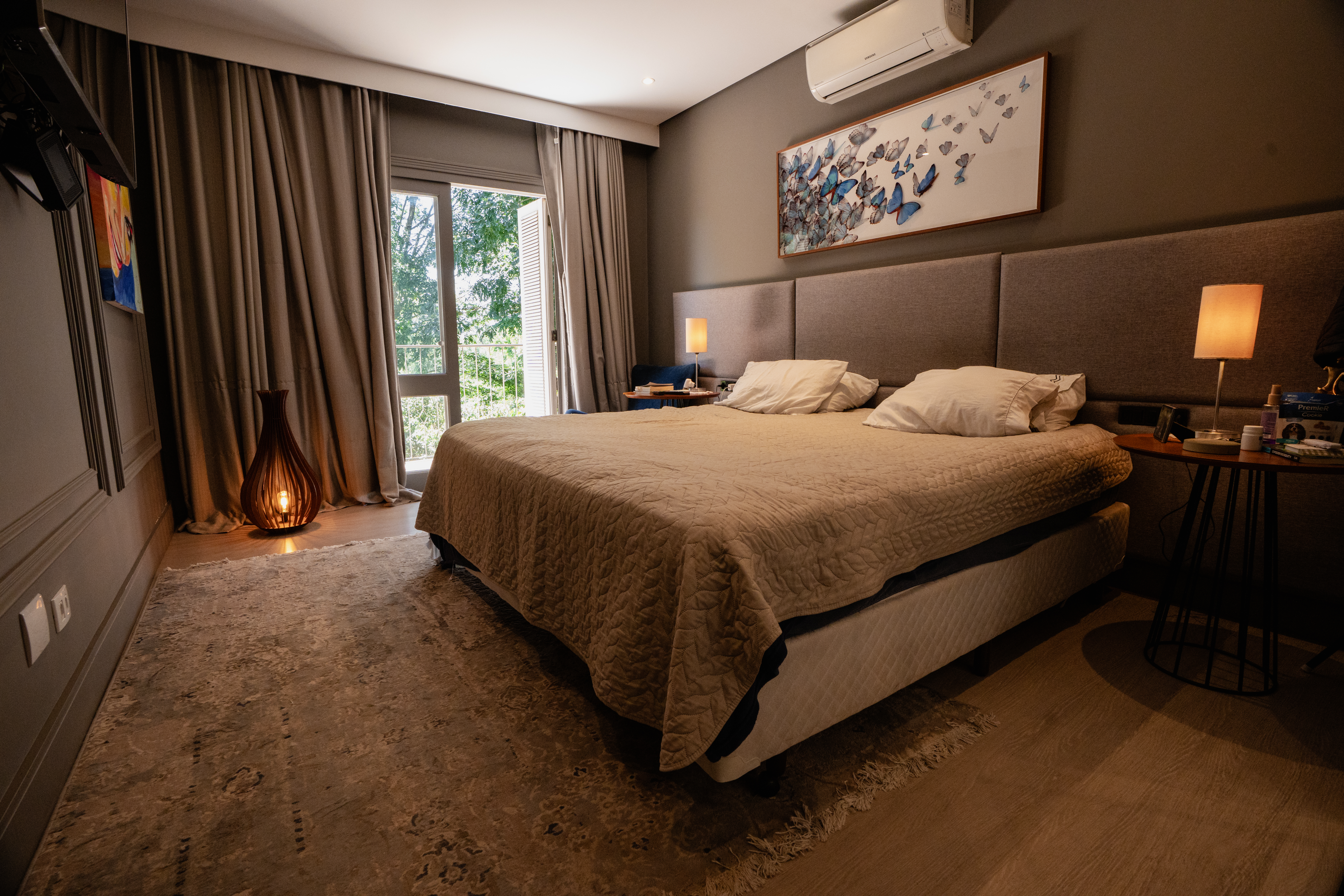 A área íntima abriga 4 suítes, todas com excelente iluminação natural e conexão com o verde. A suíte master se destaca pelo conforto, com closet, banheiro com banheira e varanda privativa voltada para a piscina e a mata. Há ainda uma suíte configuração inteligente que hoje integra duas suítes, criando uma área íntima com sala de TV e escritório privativo — totalmente reversível para o layout original, se desejado.