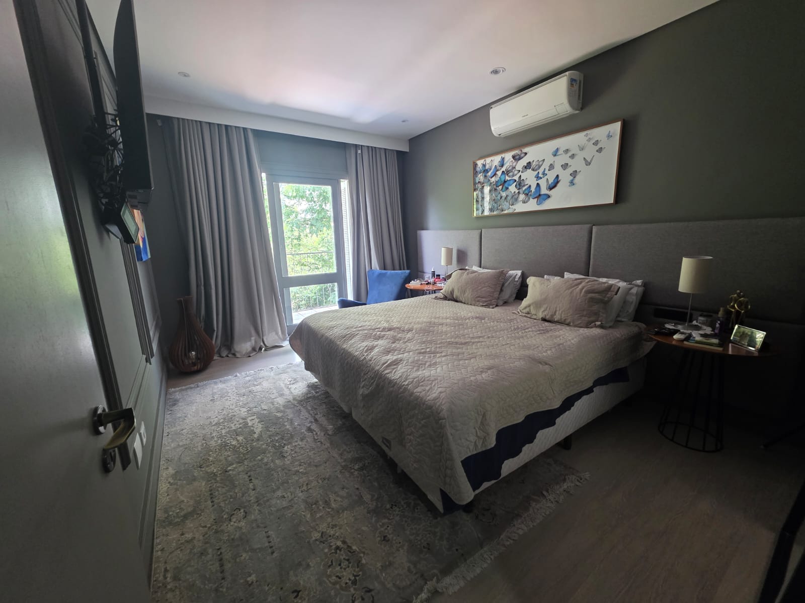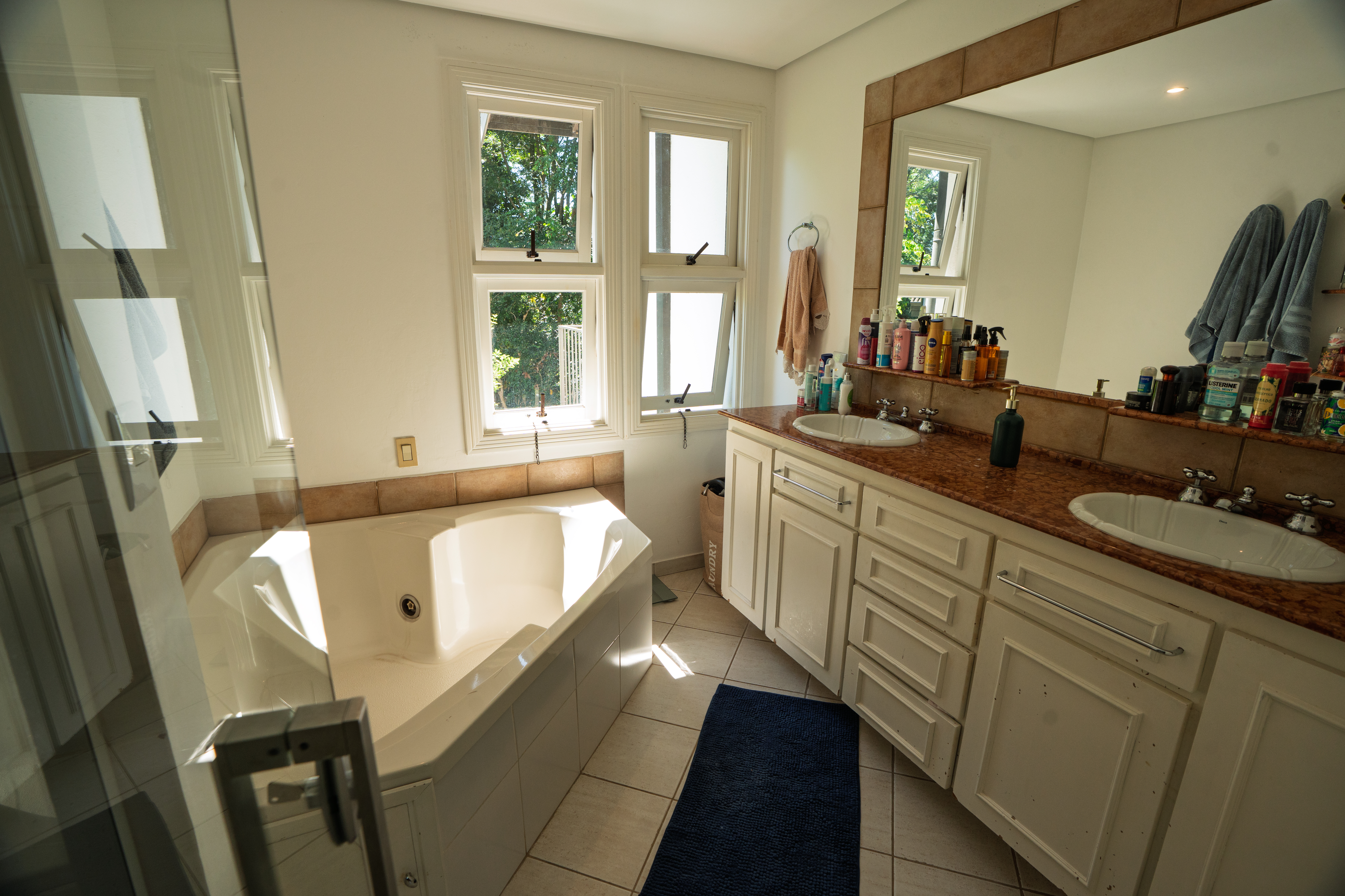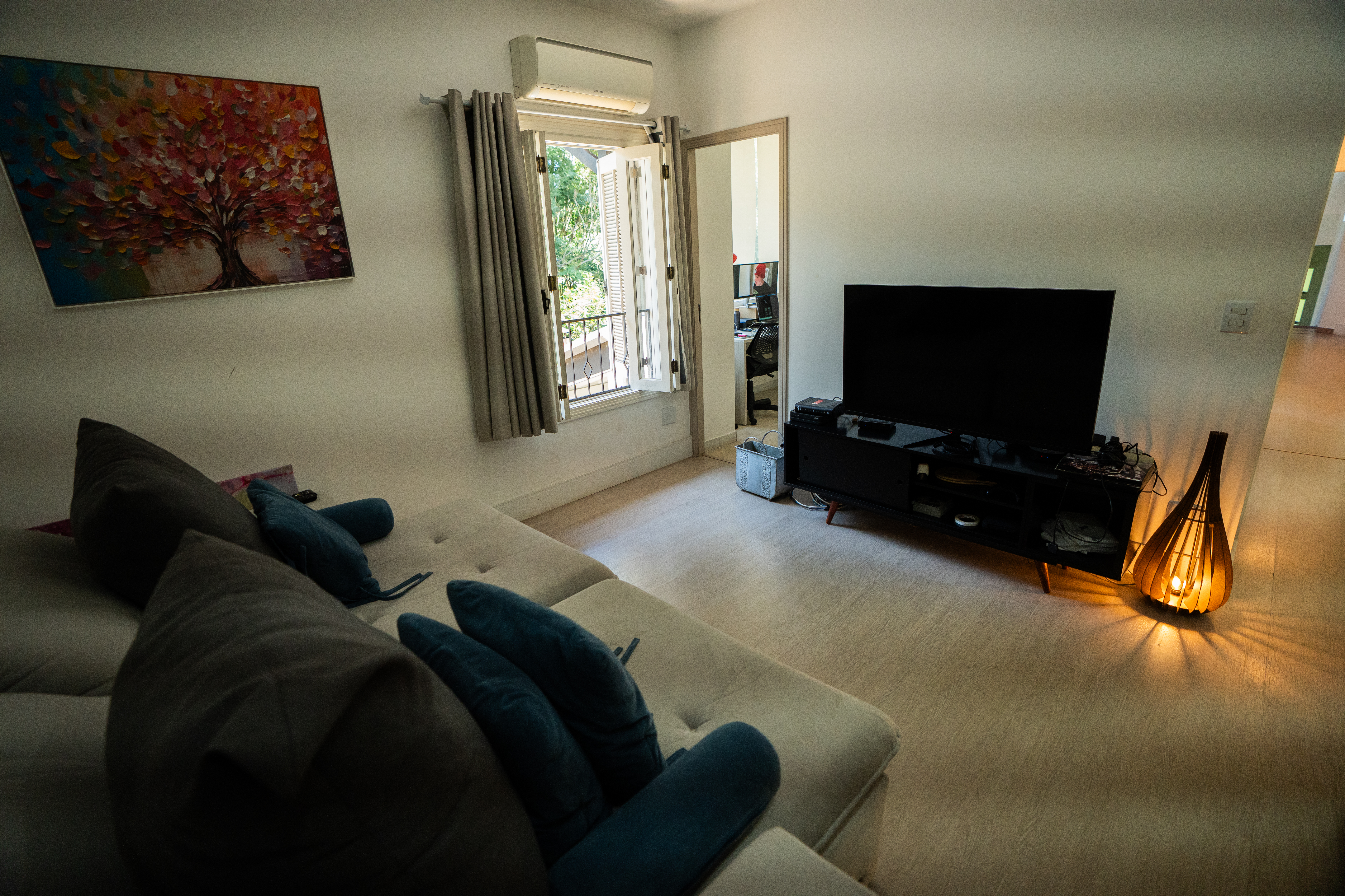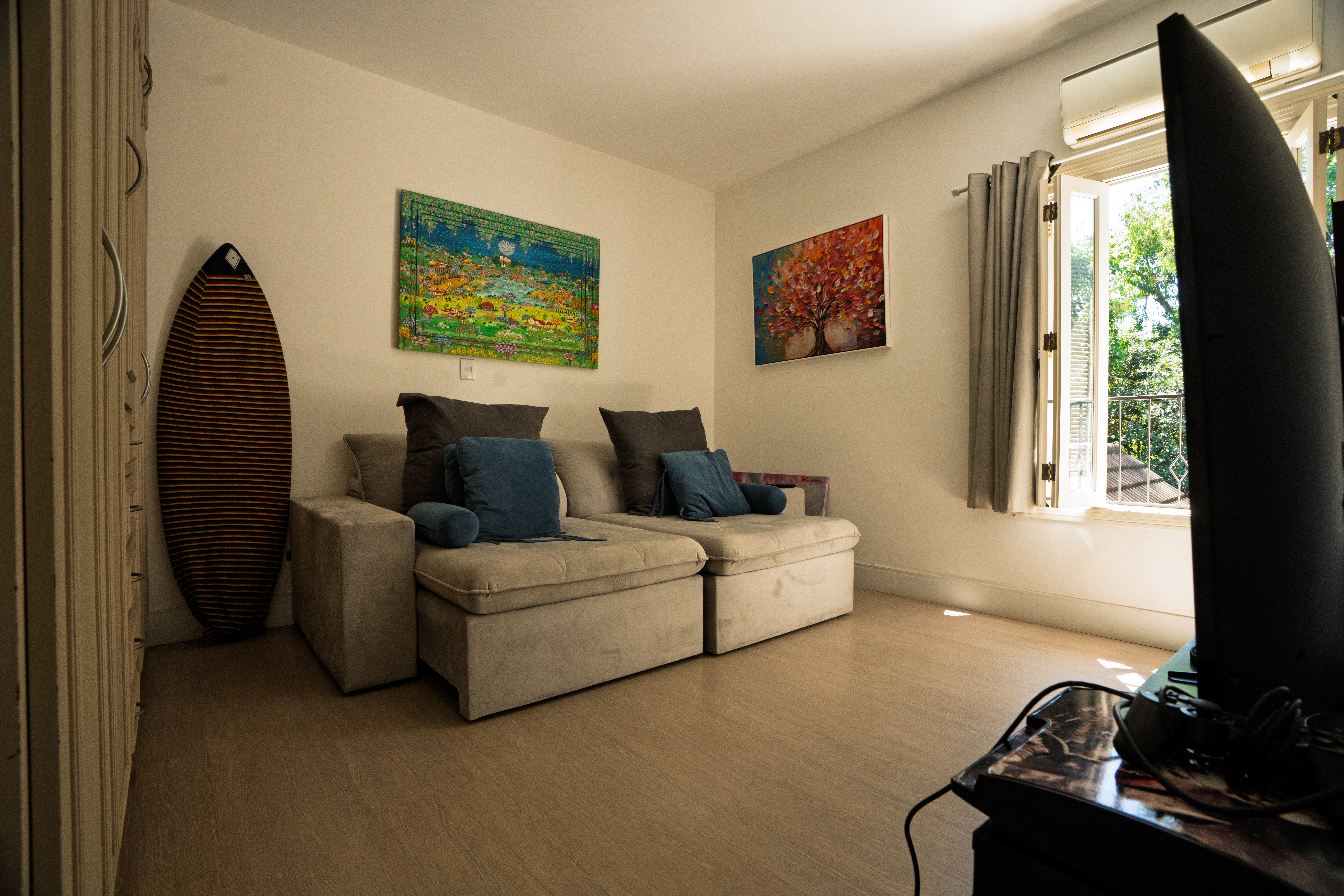 A área íntima abriga 4 suítes, todas com excelente iluminação natural e conexão com o verde. A suíte master se destaca pelo conforto, com closet, banheiro com banheira e varanda privativa voltada para a piscina e a mata. Há ainda uma suíte configuração inteligente que hoje integra duas suítes, criando uma área íntima com sala de TV e escritório privativo — totalmente reversível para o layout original, se desejado.