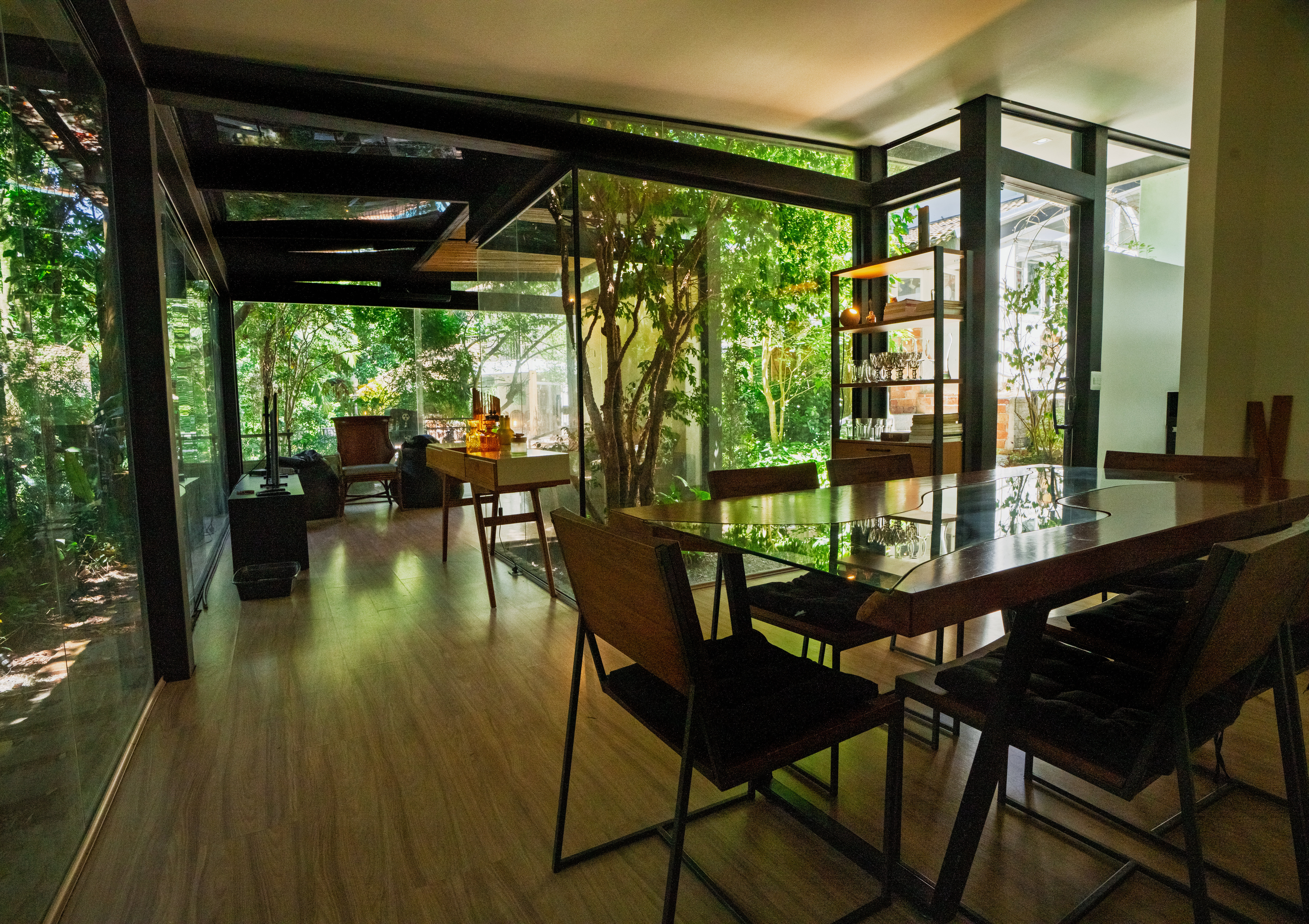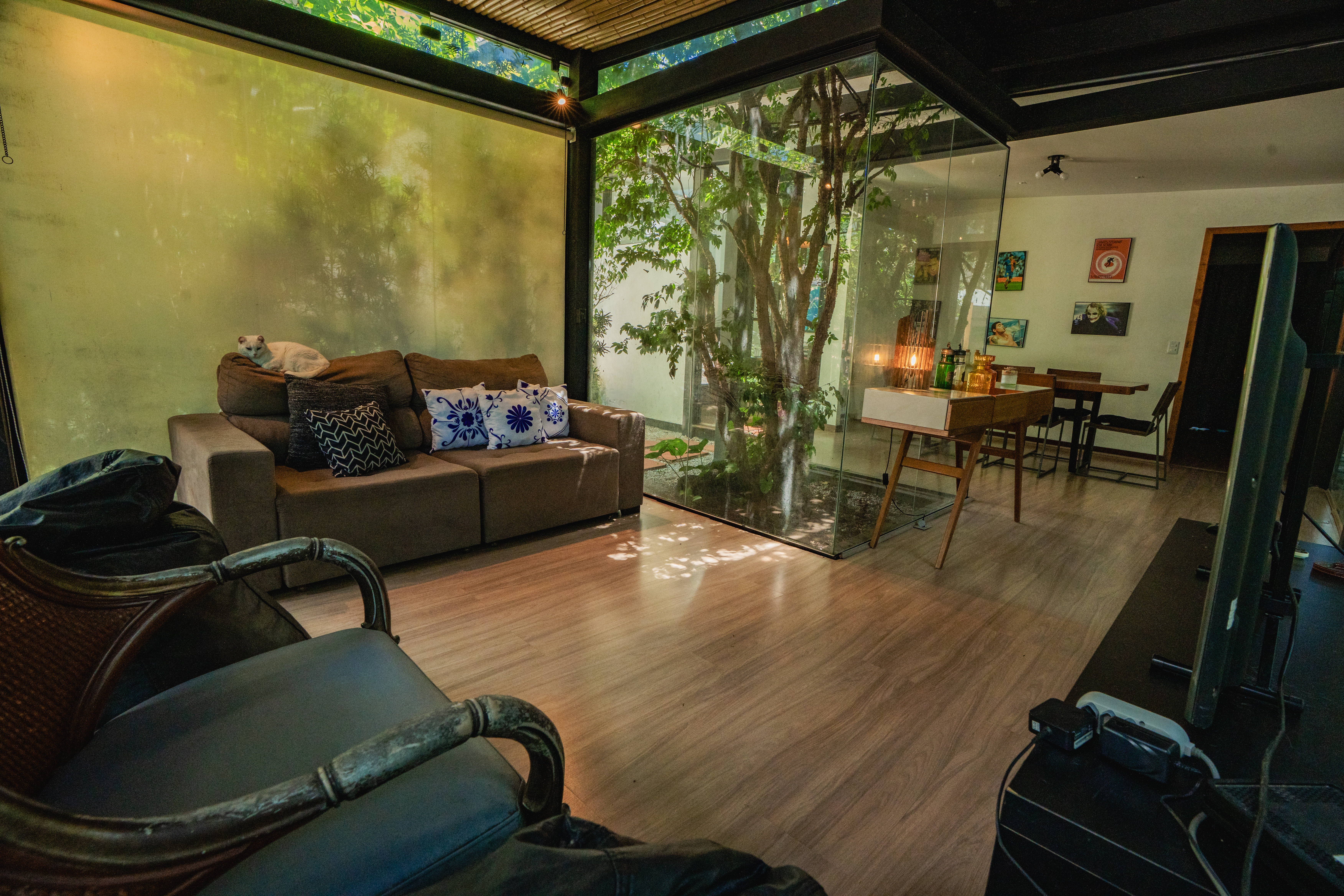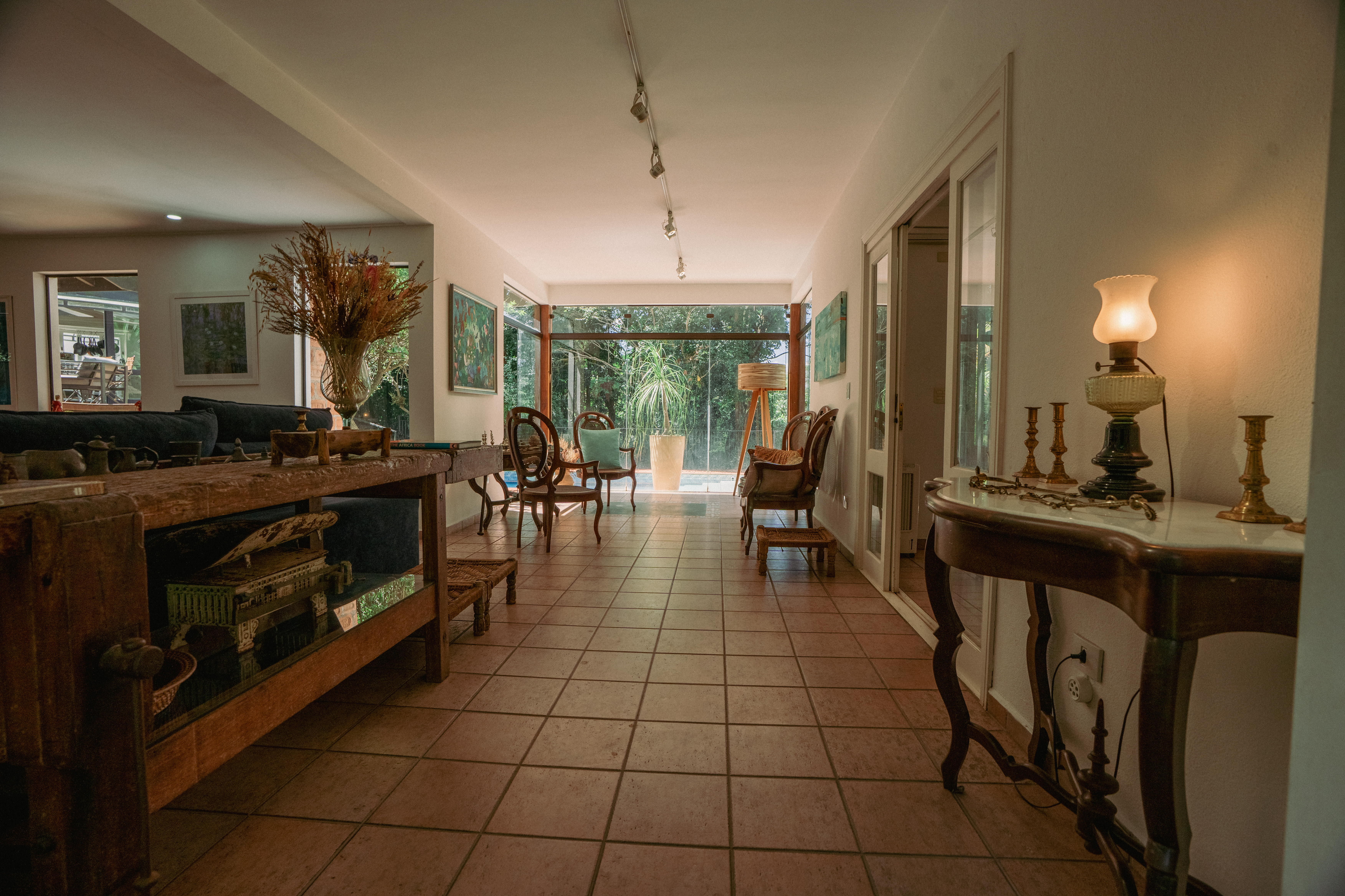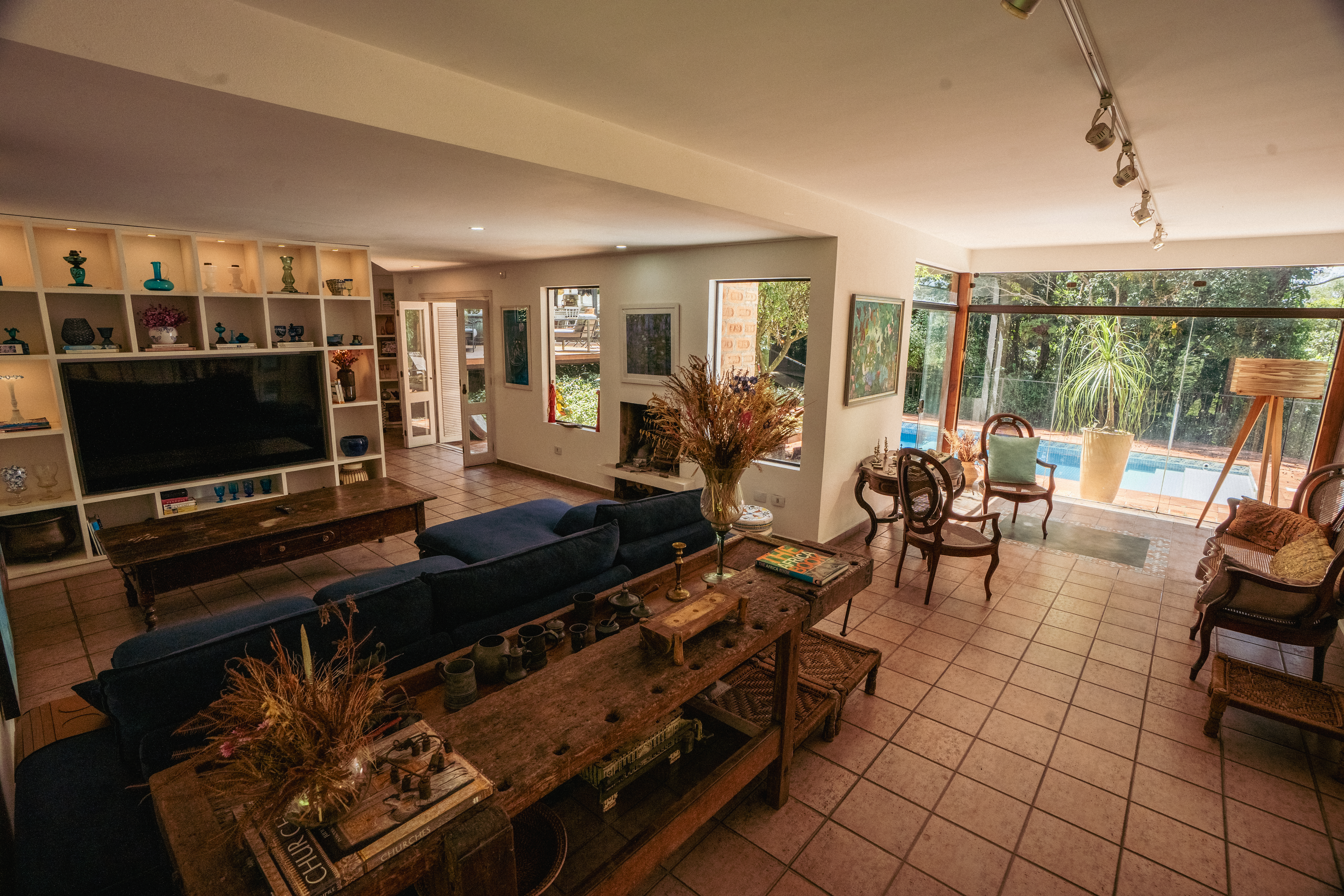 A casa principal apresenta uma planta fluida e acolhedora. A área social conta com diferentes ambientes de estar — incluindo uma sala totalmente envidraçada, voltada para a piscina — além de uma sala hoje configurada como bar, que pode assumir diversas funções conforme o estilo de vida do futuro morador.