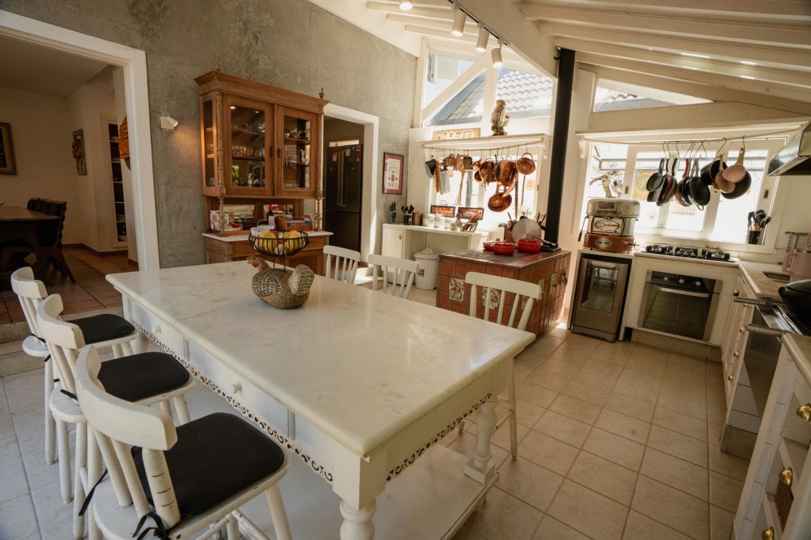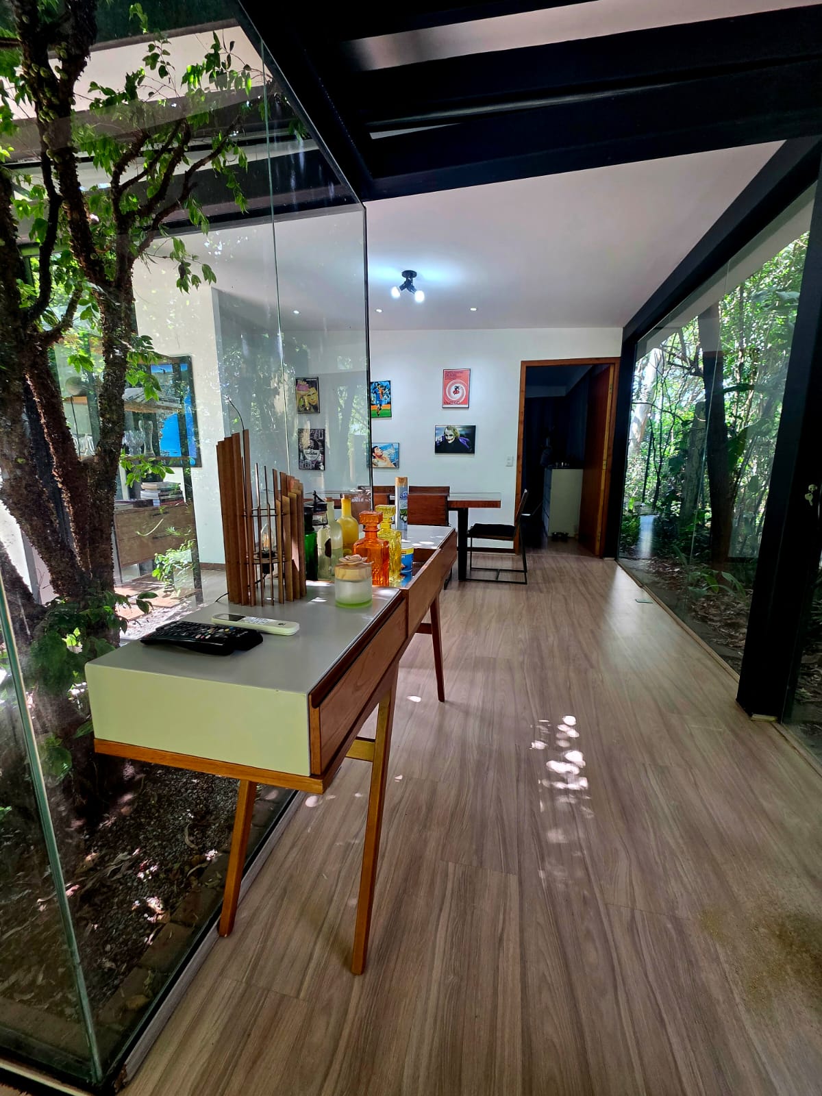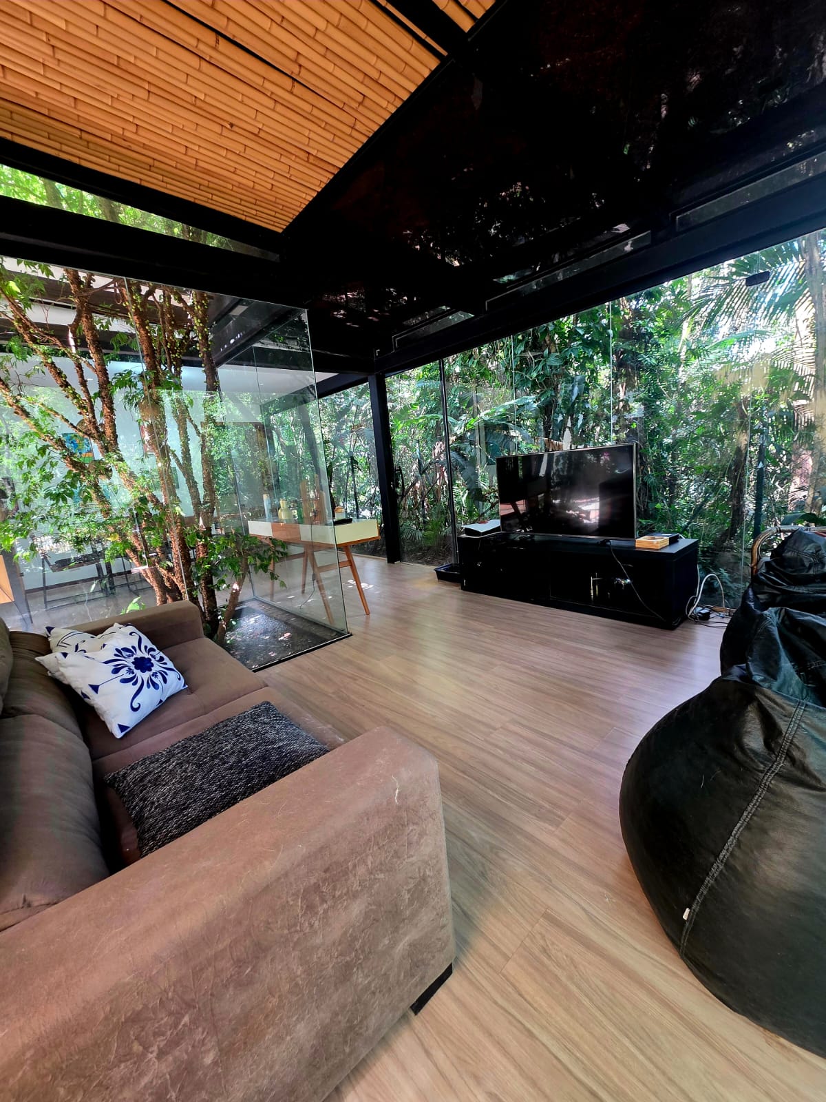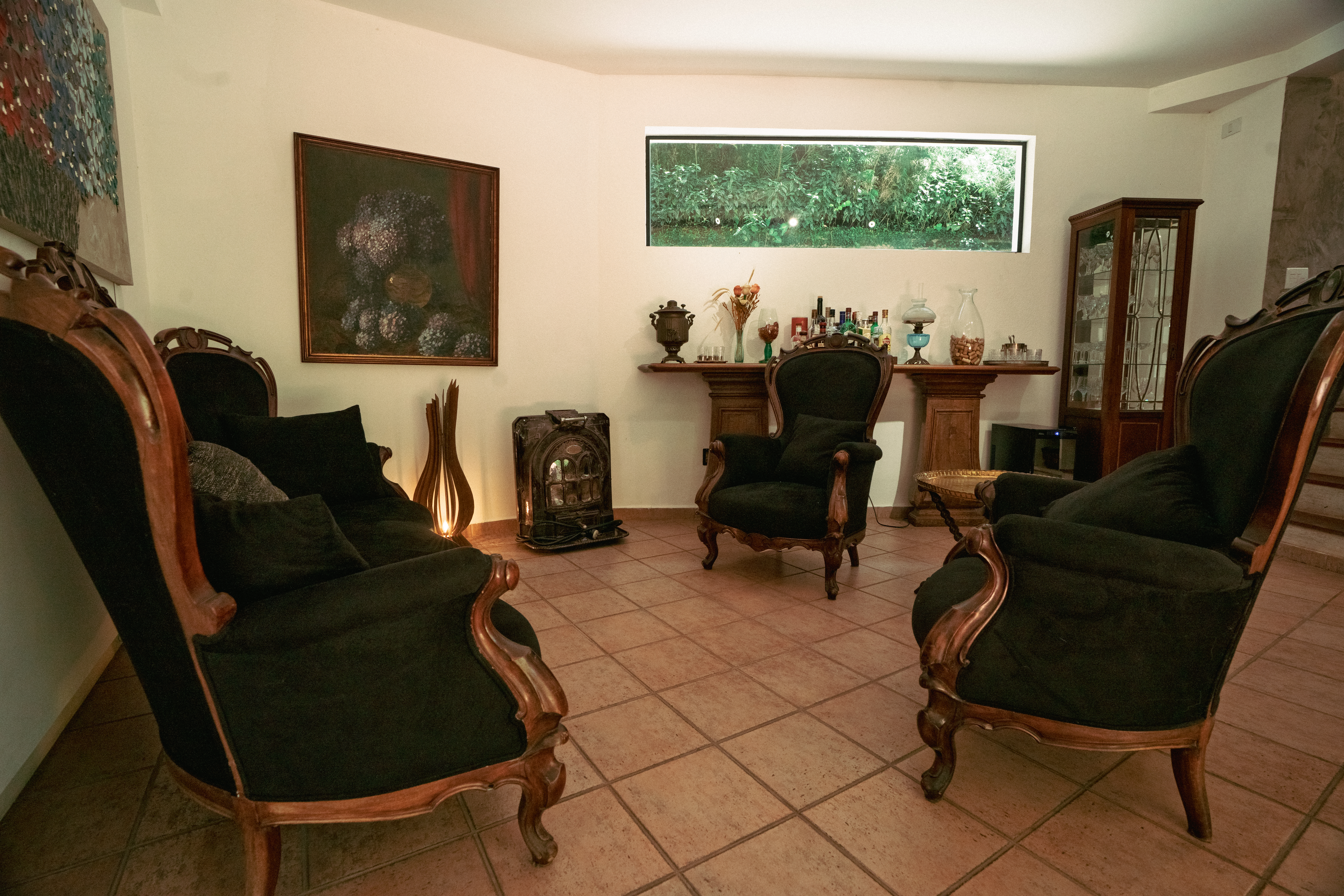 A casa principal apresenta uma planta fluida e acolhedora. A área social conta com diferentes ambientes de estar — incluindo uma sala totalmente envidraçada, voltada para a piscina — além de uma sala hoje configurada como bar, que pode assumir diversas funções conforme o estilo de vida do futuro morador.