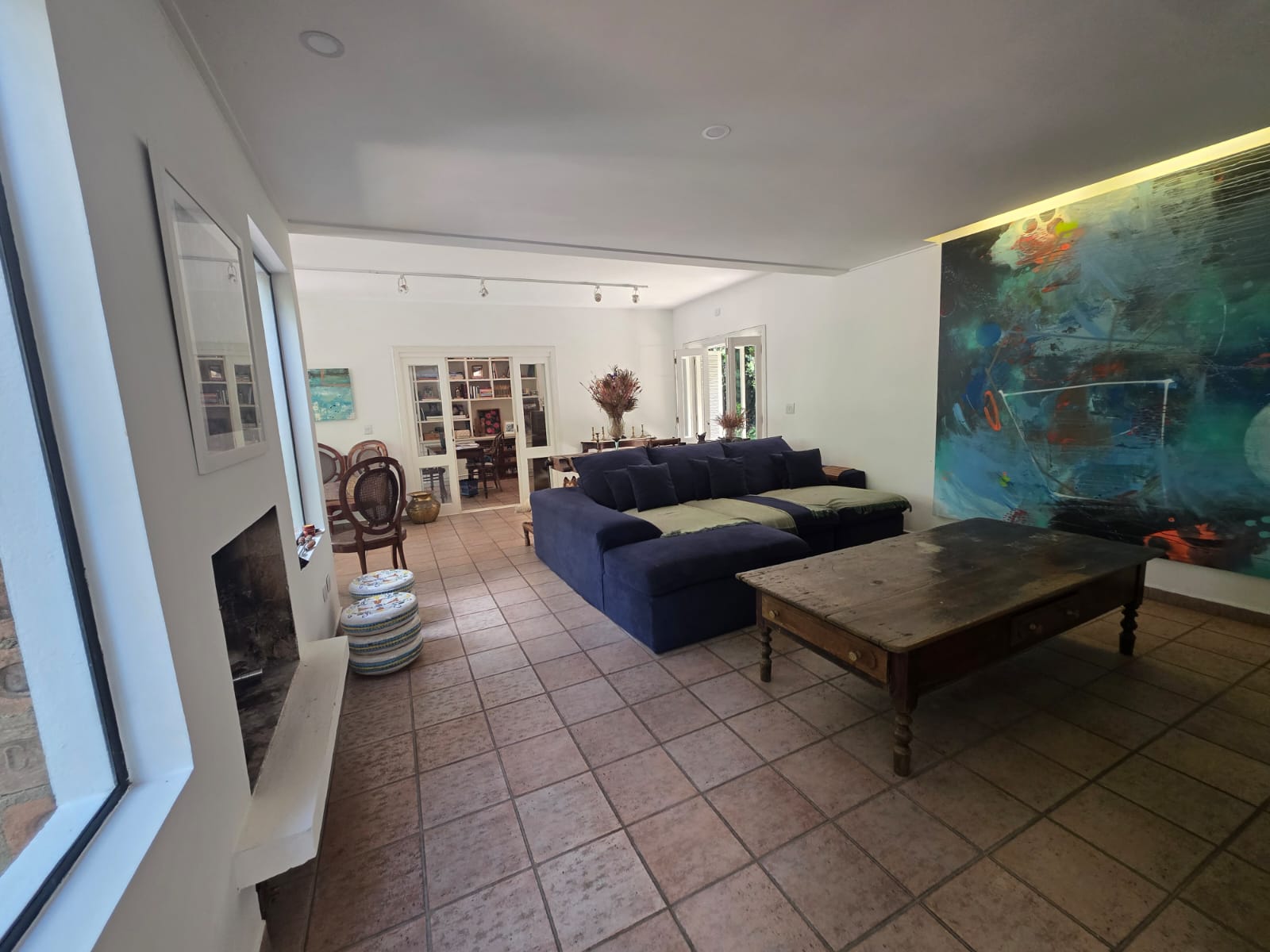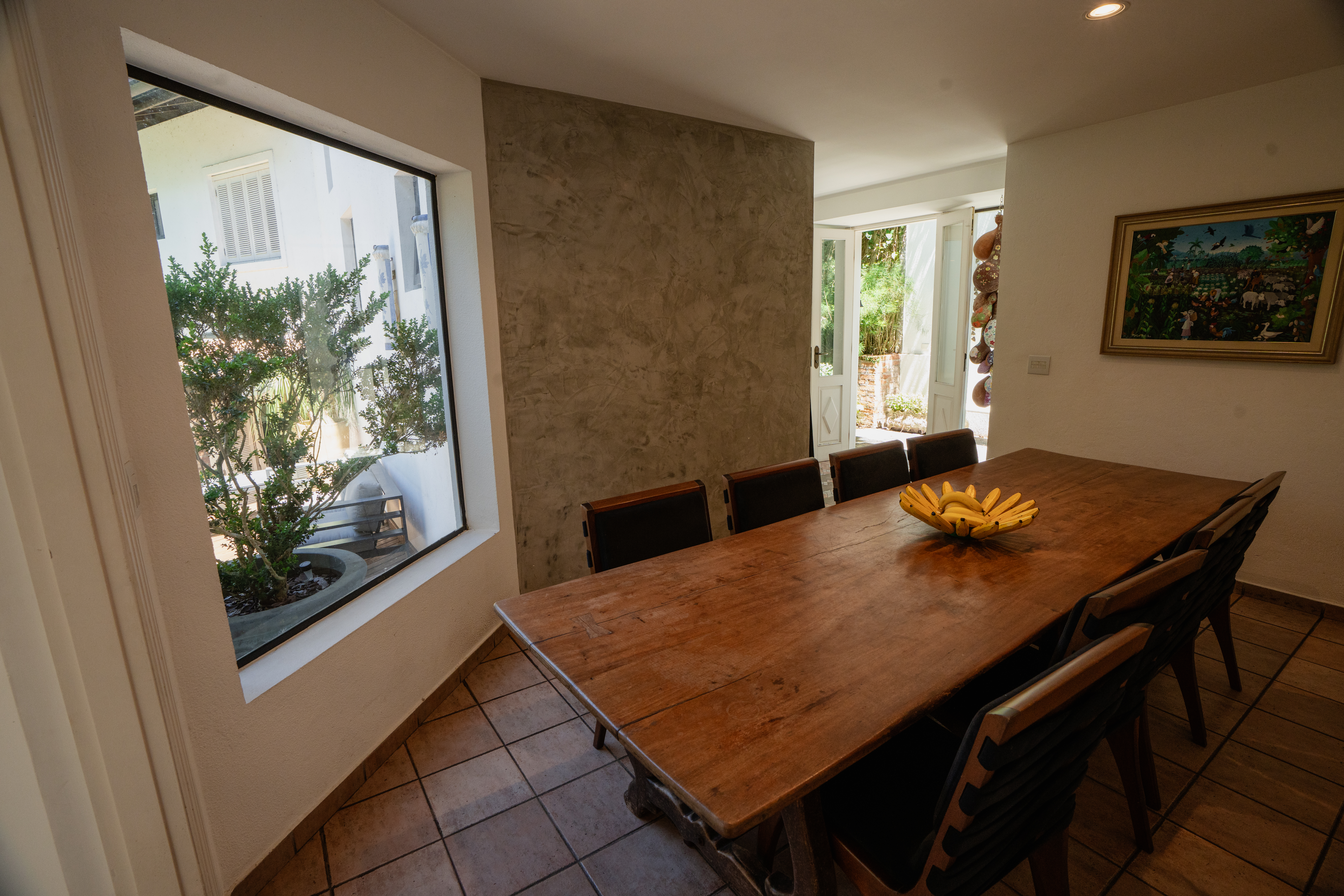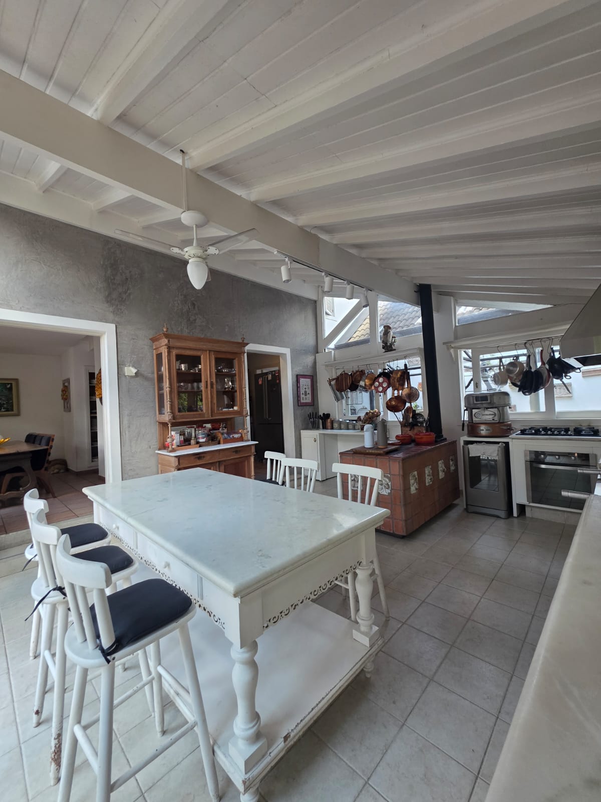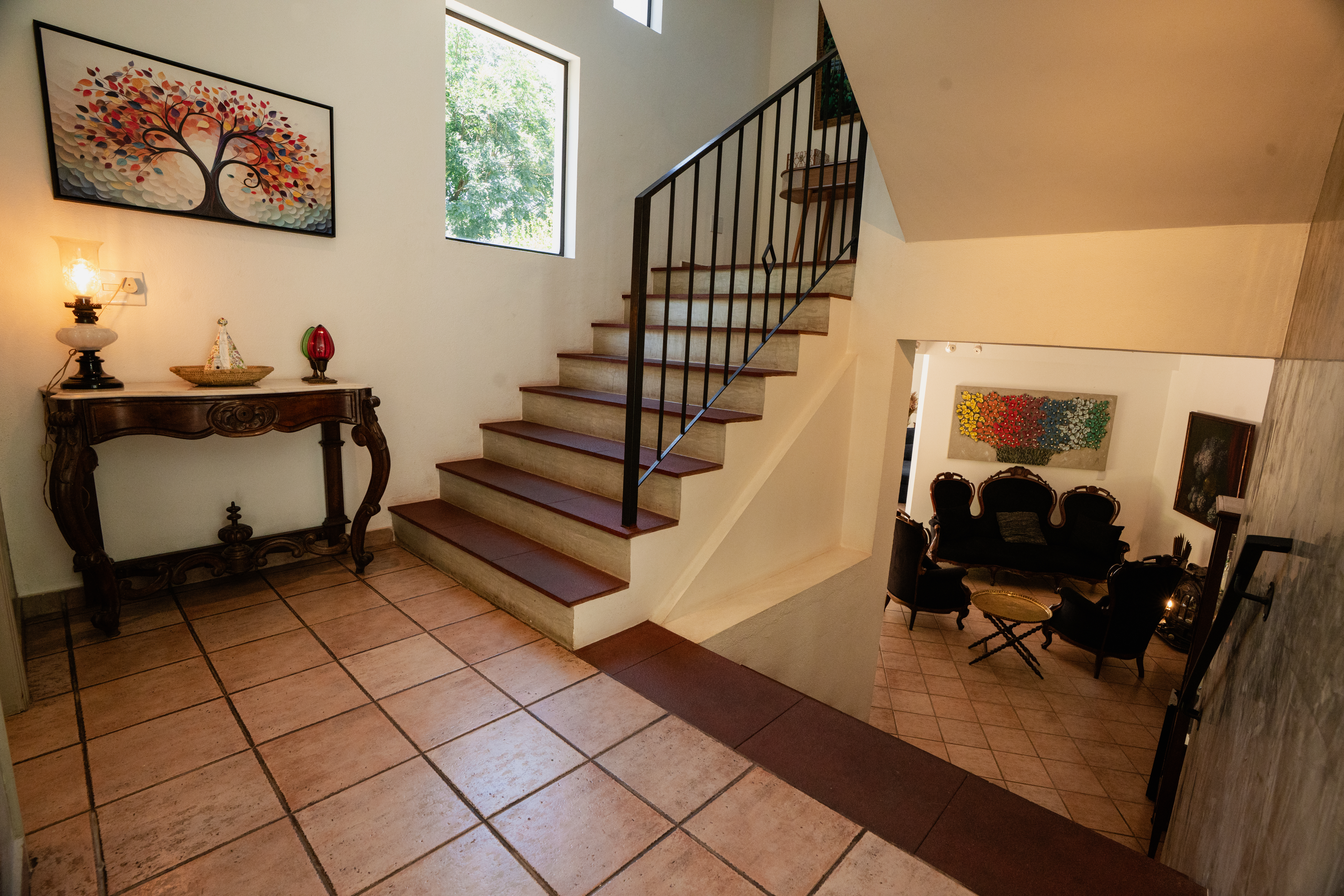 A casa principal apresenta uma planta fluida e acolhedora. A área social conta com diferentes ambientes de estar — incluindo uma sala totalmente envidraçada, voltada para a piscina — além de uma sala hoje configurada como bar, que pode assumir diversas funções conforme o estilo de vida do futuro morador.
