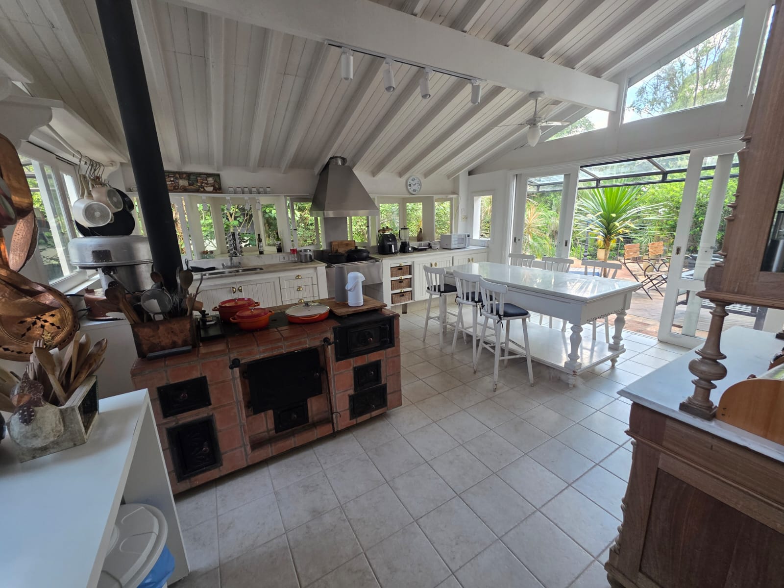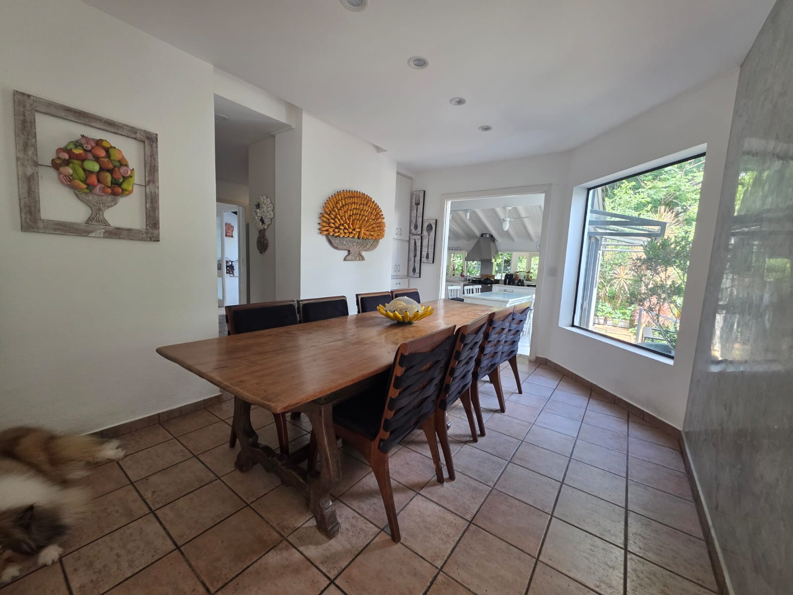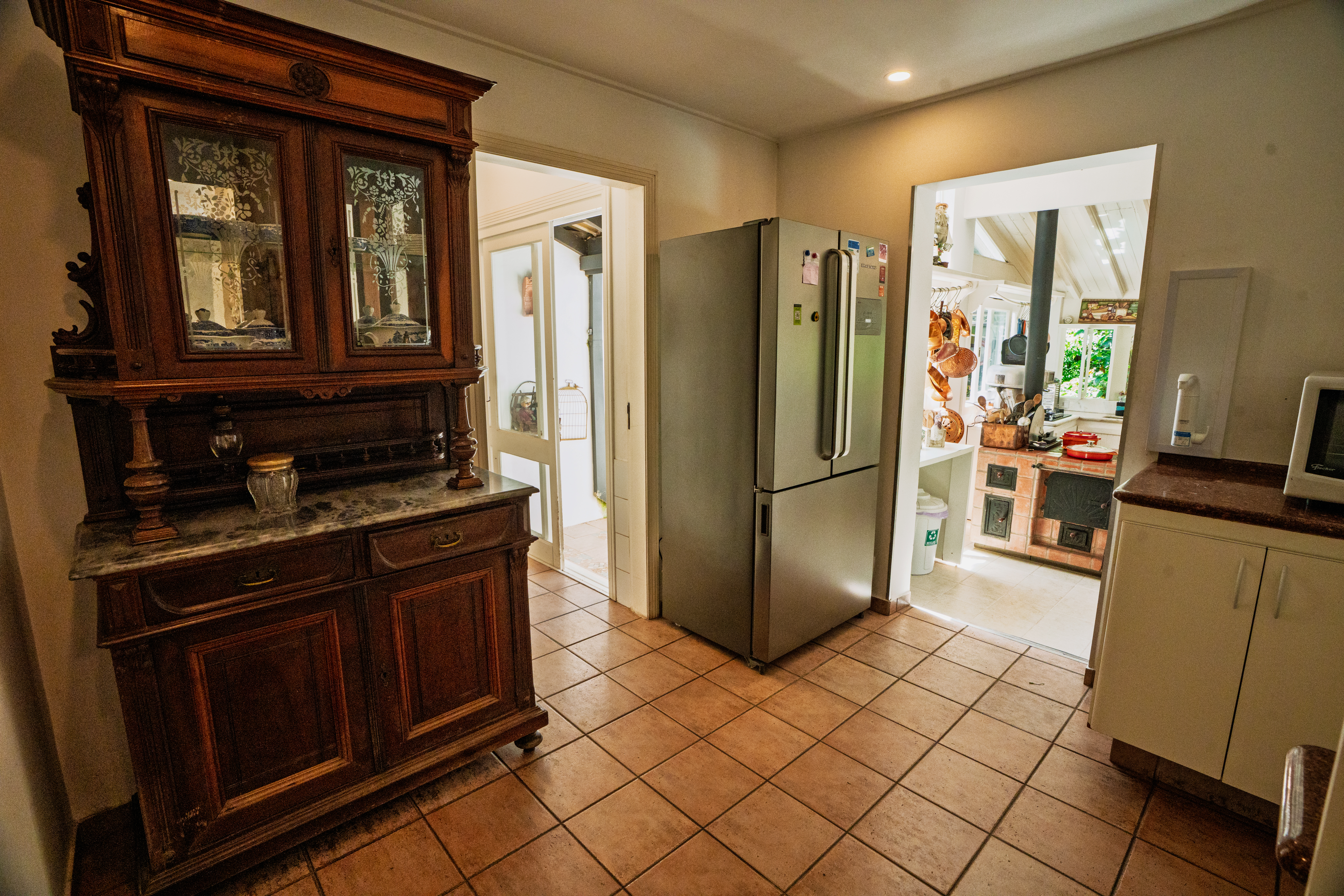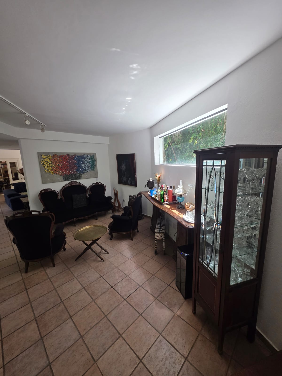 A casa principal apresenta uma planta fluida e acolhedora. A área social conta com diferentes ambientes de estar — incluindo uma sala totalmente envidraçada, voltada para a piscina — além de uma sala hoje configurada como bar, que pode assumir diversas funções conforme o estilo de vida do futuro morador.