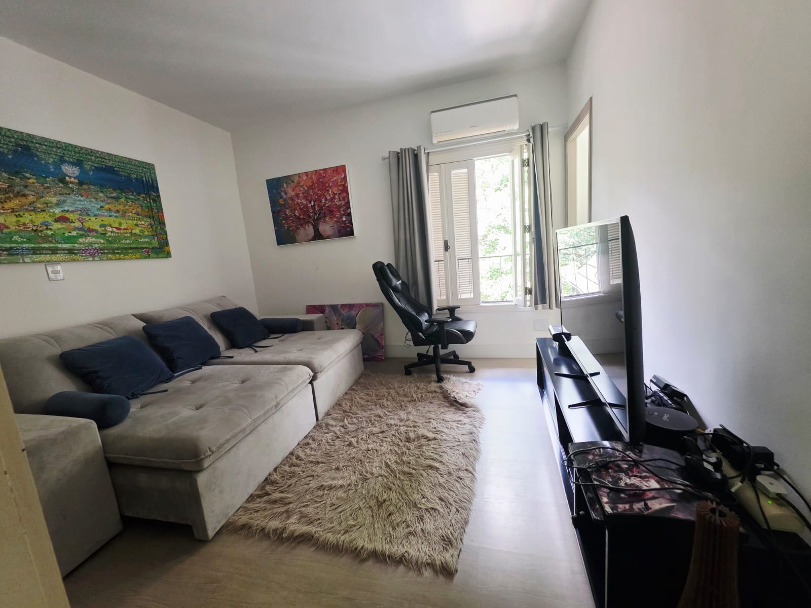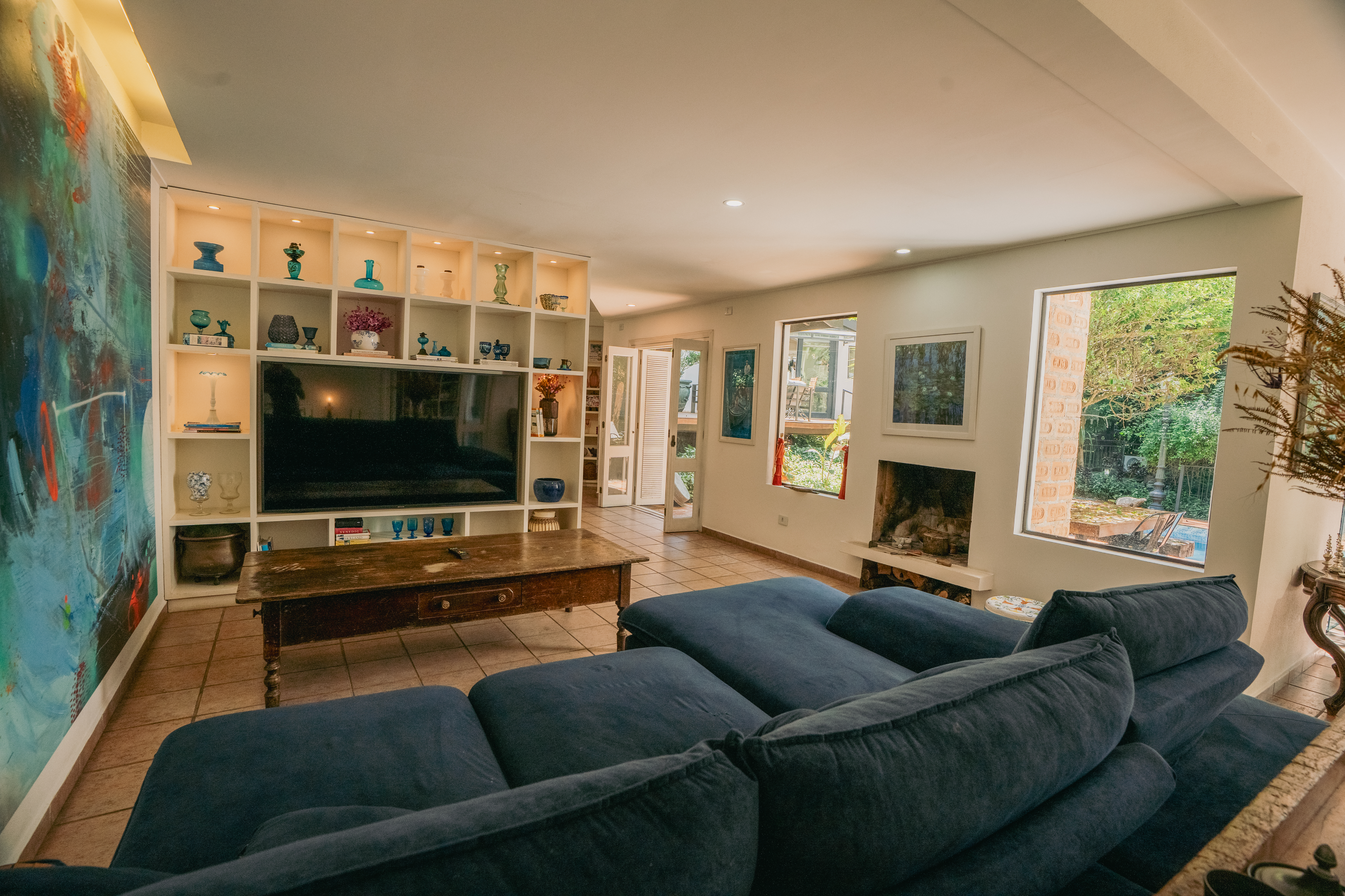 A sala de TV, com lareira, combina conforto e vista permanente para o jardim, criando um ambiente de permanência e bem-estar.